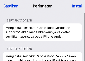 Layar akan menampilkan sertifikat yang akan diinstal. Klik Instal di kanan atas layar.